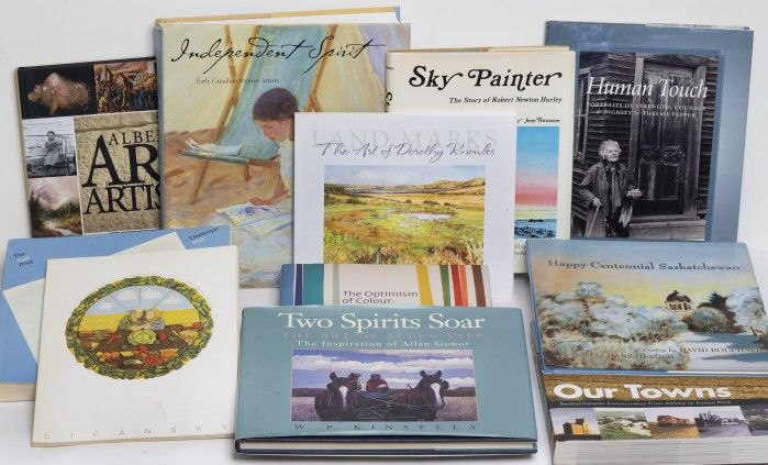 Hundreds of books on offer. Subjects include Allen Sapp, Hans Herold, Bob Boyer, Thelma Pepper, Courtney Milne, Saskatchewan ceramics, Saskatchewan architecture, Canadian folk art, many Canadian and International artists and art movements.